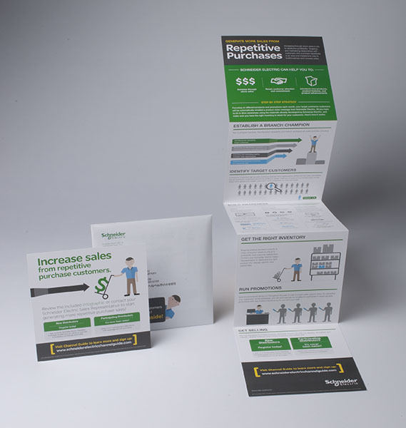This example showcases an infographic-style multi-fold direct mail piece. This piece skillfully incorporates an infographic in all of its glory, taking up the real estate of all four panels with large typeface, concise info and colorful iconography. Each bold element of the display serves to draw attention to the piece's main message.