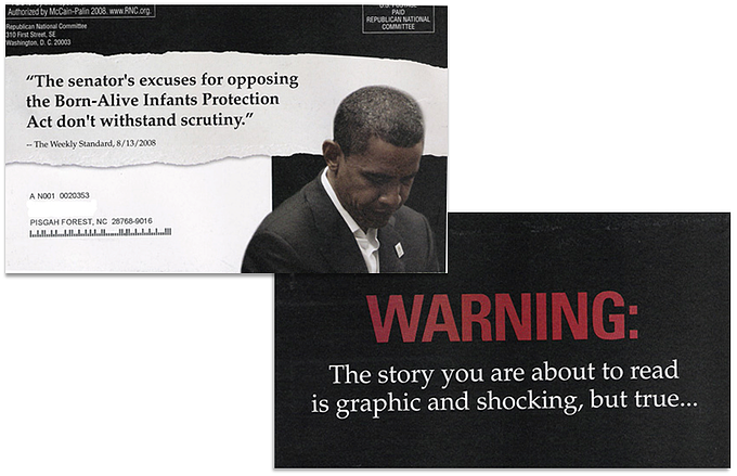 In another example, we see an attack mailer calling out Obama's time as a Senator and his stance on the Born-Alive Infants Protection Act. Important to note: we see this piece of DM using traditionally digital tactics, i.e. the clickbait, scare-tactic in order to drive response rates.
